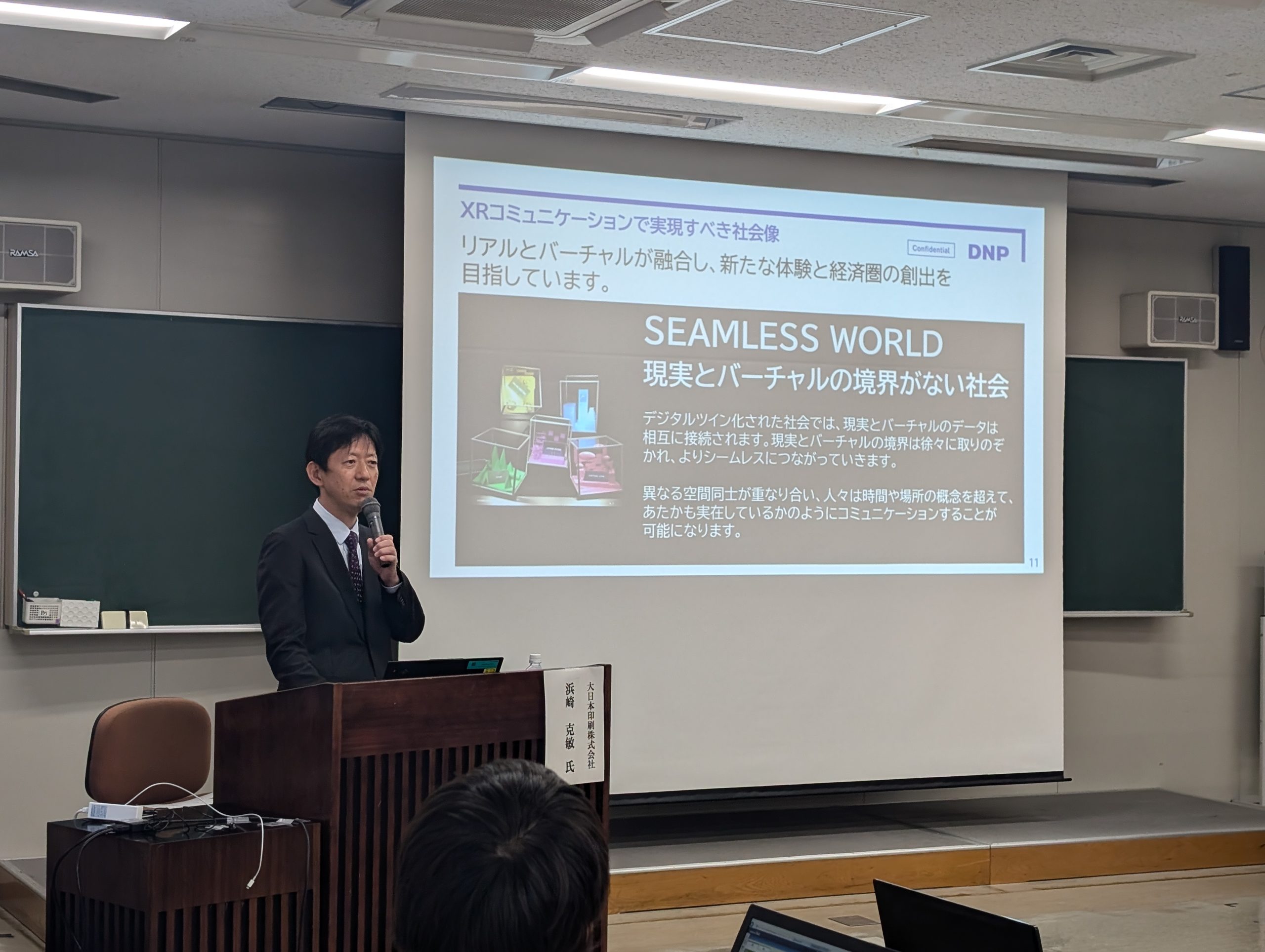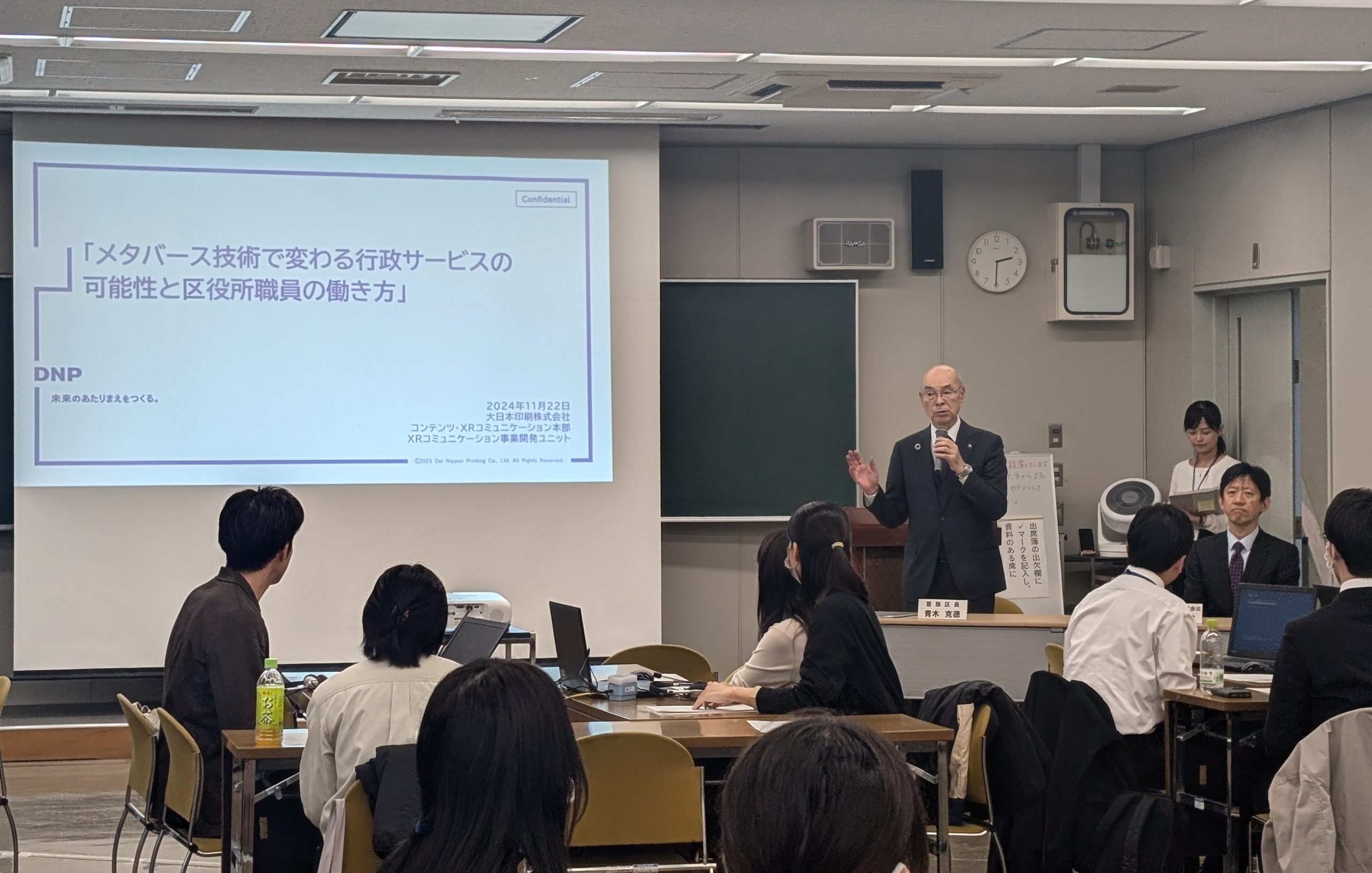 2024年11月、一般社団法人プラチナ構想ネットワーク主催の「プラチナ構想スクール@葛飾」にて、DNPのXR関連事業を担当しているXRコミュニケーション事業開発ユニット・ユニット長 浜崎より講演をさせていただきました。また、現在さまざまな自治体の方にご活用いただいている「メタバース役所」サービスの体験会も実施しました。